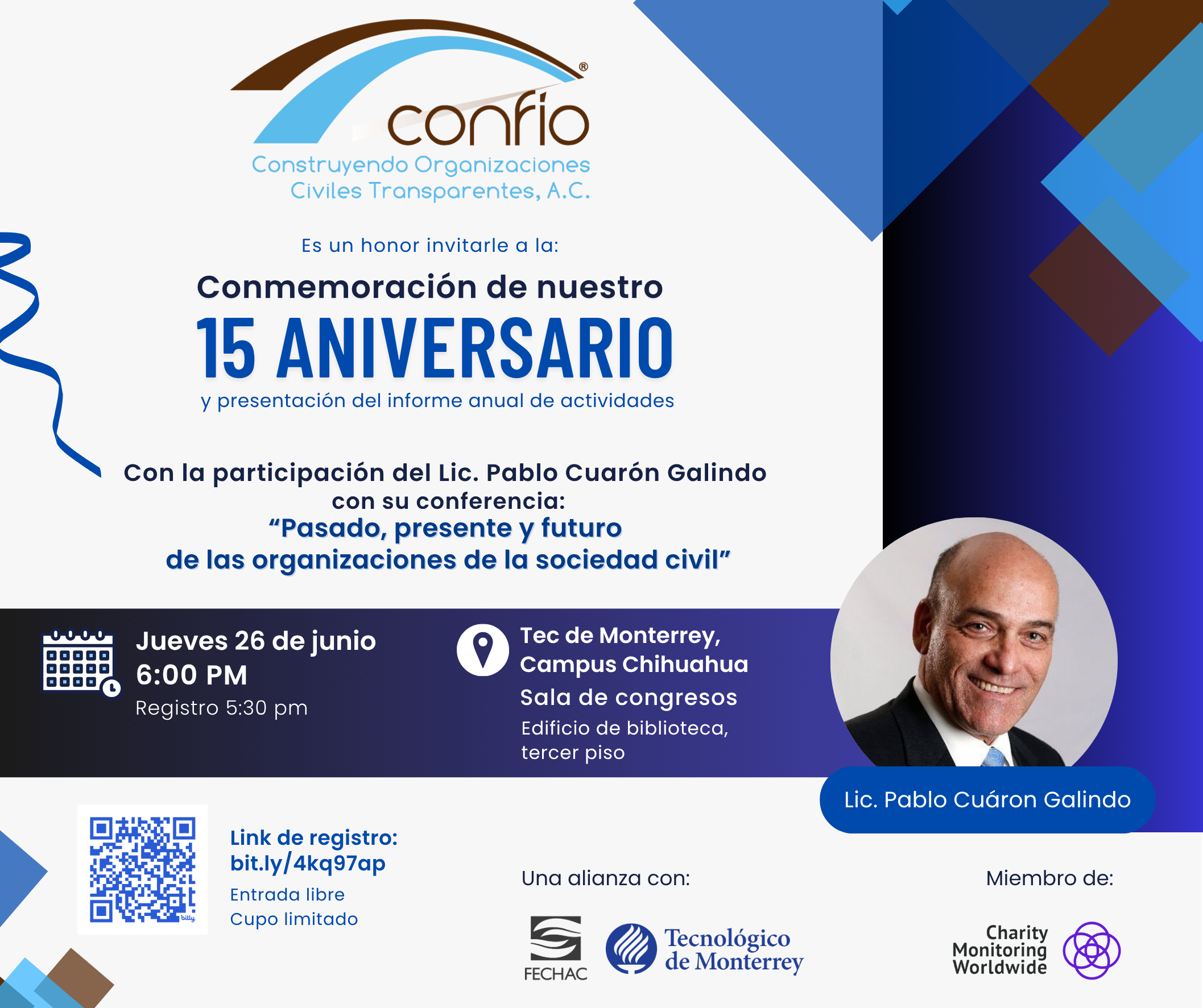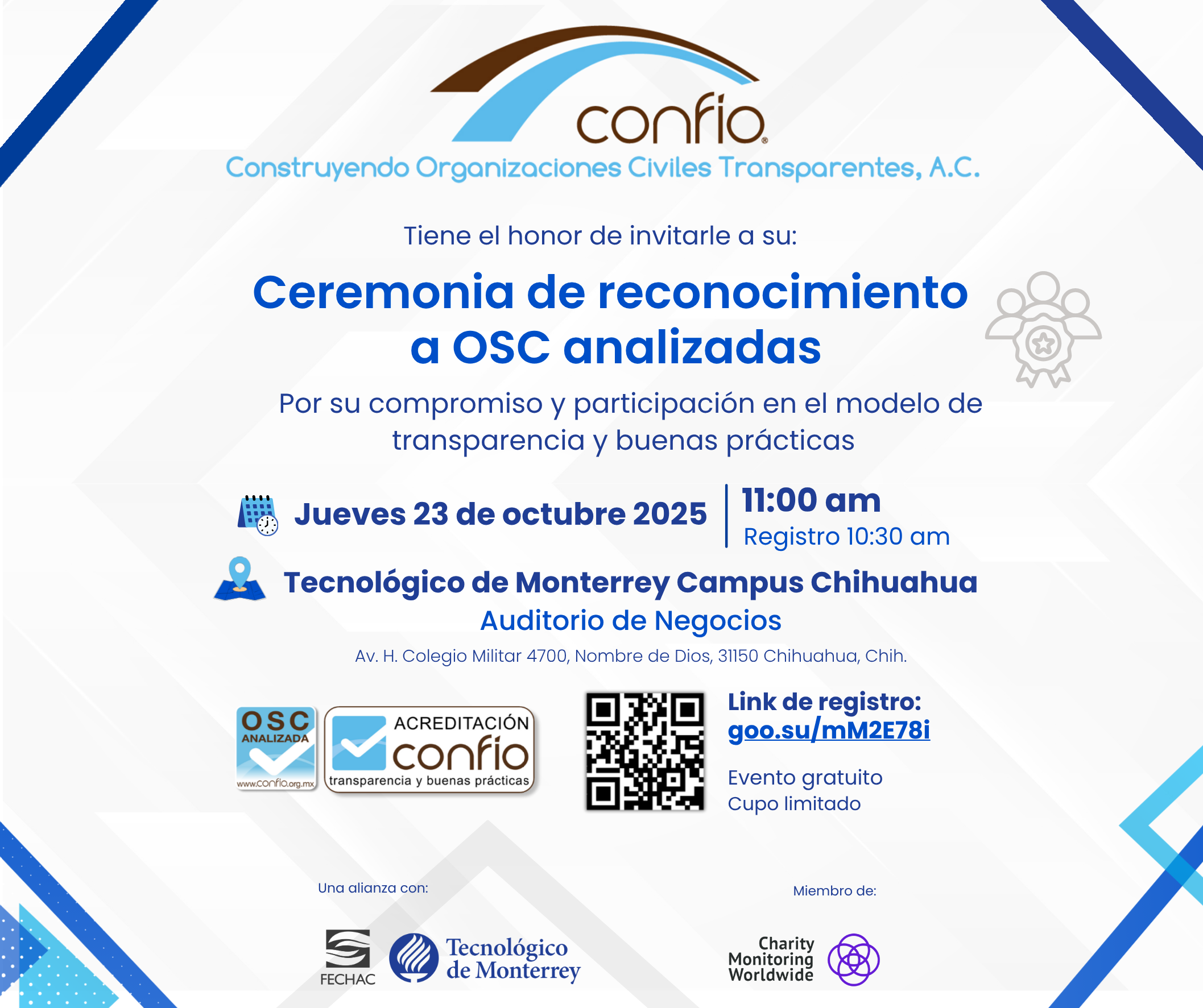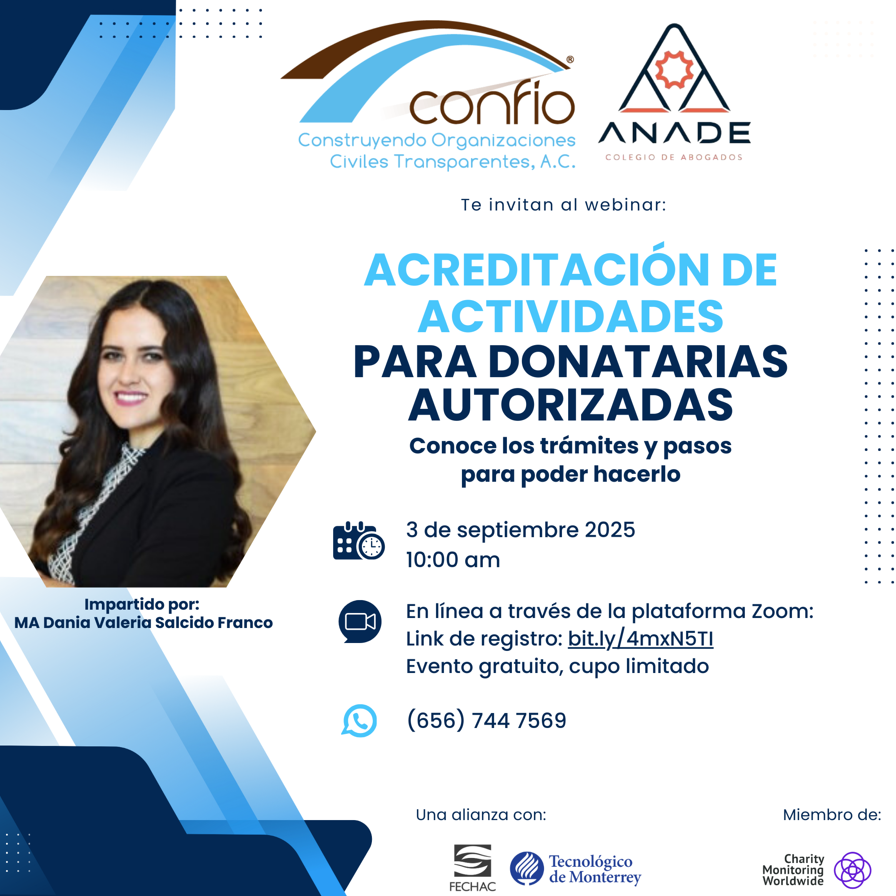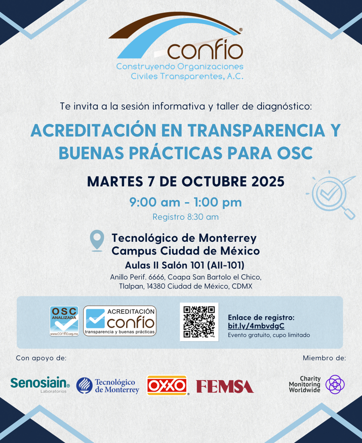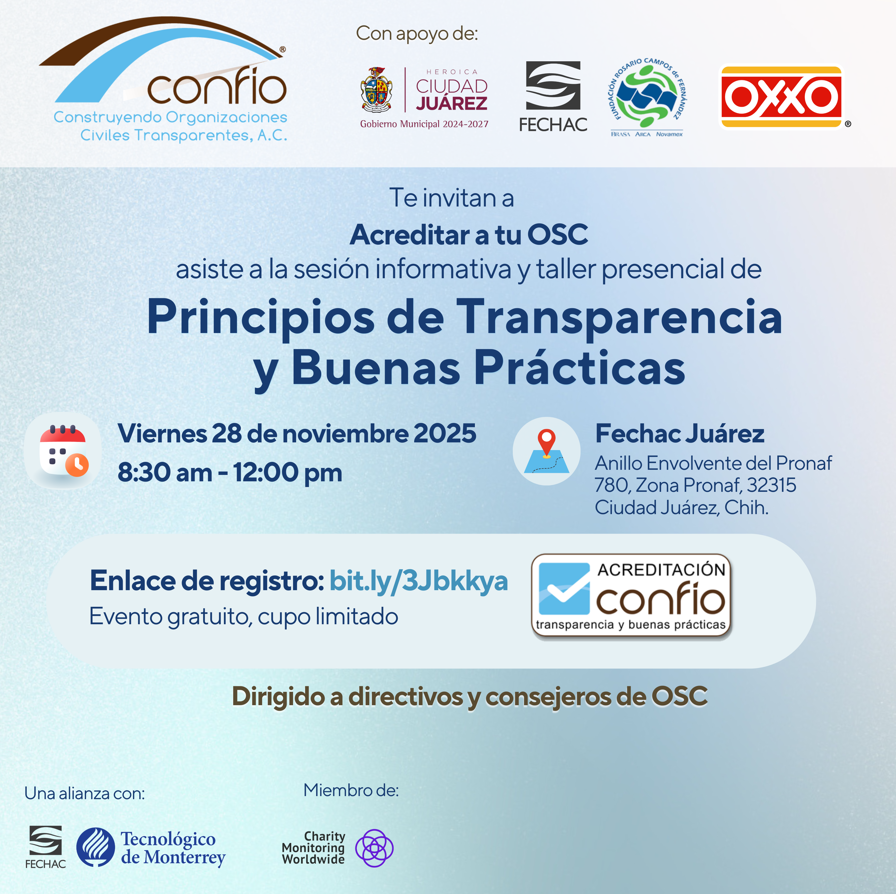Miércoles 21 de febrero de 2018. 07:00 p.m. – 8:30 p.m. Lugar: Sala Borrego de ITESM Campus Chihuahua. Evento gratuito para OSC analizadas por Confío, $100 para OSC que no lo están.
