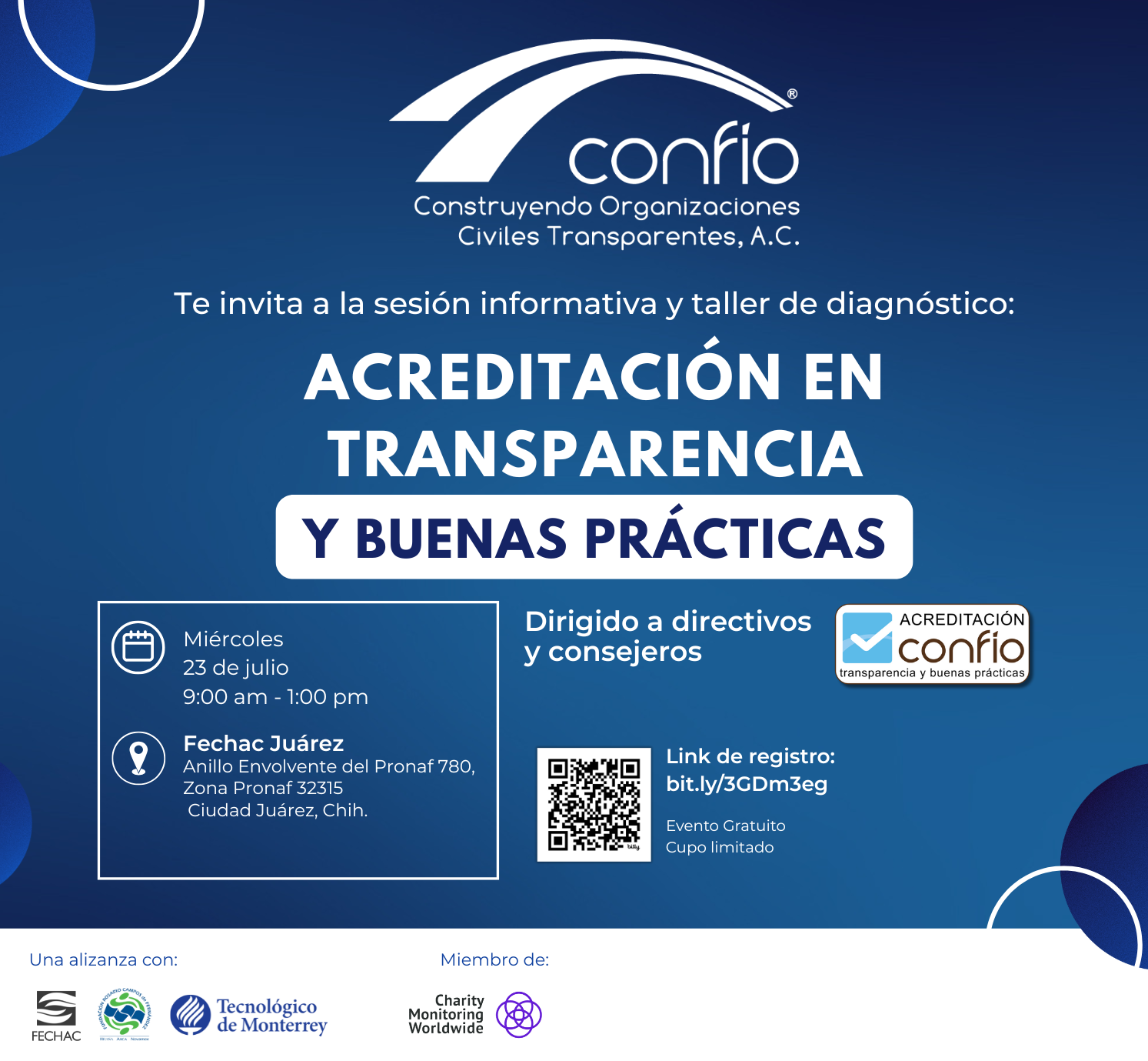 Miércoles 28 de febrero de 2018. 07:00 p.m. – 8:30 p.m. Lugar: Sala de Consejo de ITESM Campus Chihuahua. Evento gratuito para OSC analizadas por Confío, $100 para OSC que no lo están.