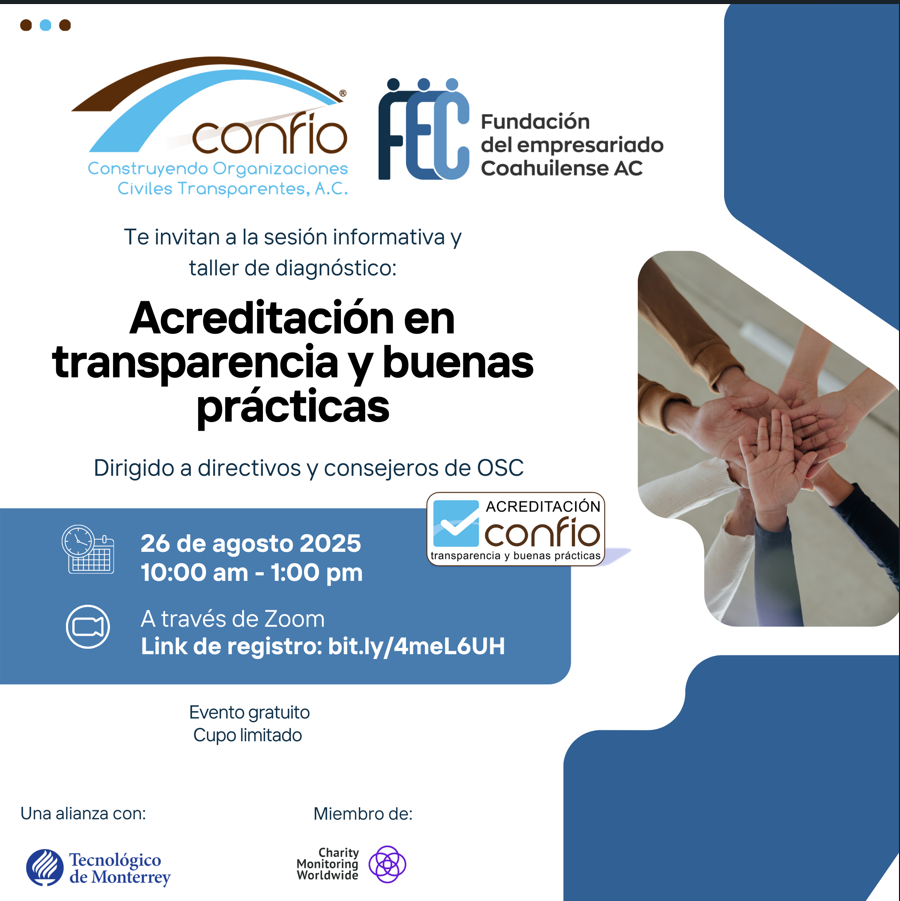Miércoles 06, miércoles 13, miércoles 20 y miércoles 27 de febrero de 2019. 08:00 a.m. – 10:00 a.m. Lugar: Fechac Juárez. Costo de $100 para OSC analizadas por Confío, $200 para OSC que no lo están.