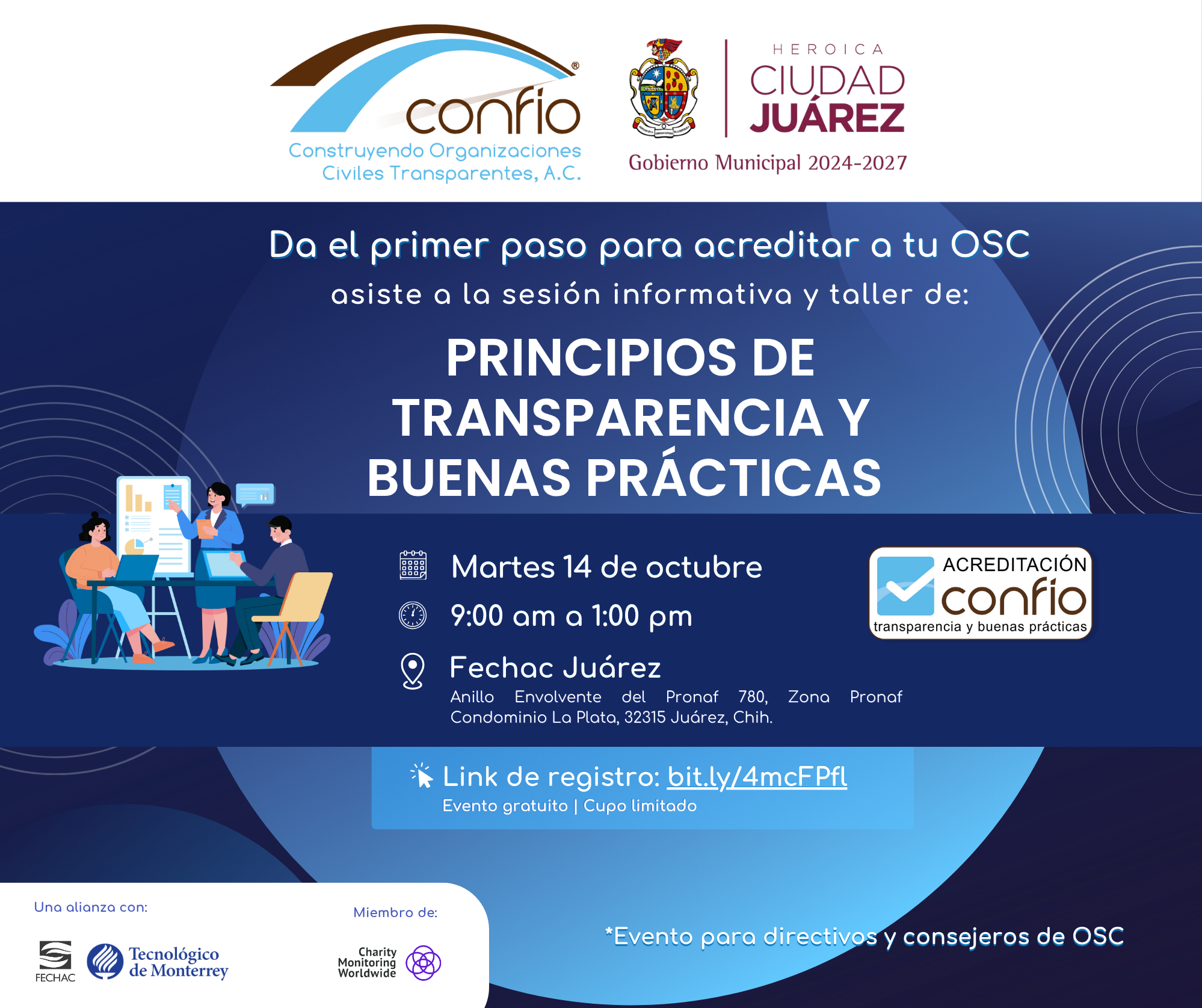 Martes 13 de febrero de 2018. 07:00 p.m. – 8:30 p.m. Lugar: Sala de Consejo de ITESM Campus Chihuahua. Evento gratuito para OSC analizadas por Confío, $100 para OSC que no lo están.